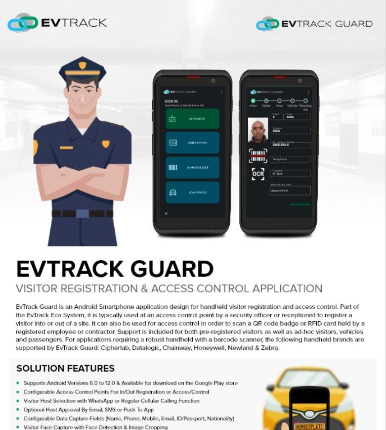 The EvTrack Guard App runs on any Android device and gives security personnel a complete mobile registration platform: scan IDs and passports, capture vehicle details and passengers, issue QR credentials, and manage check-in and check-out — all without a fixed kiosk.